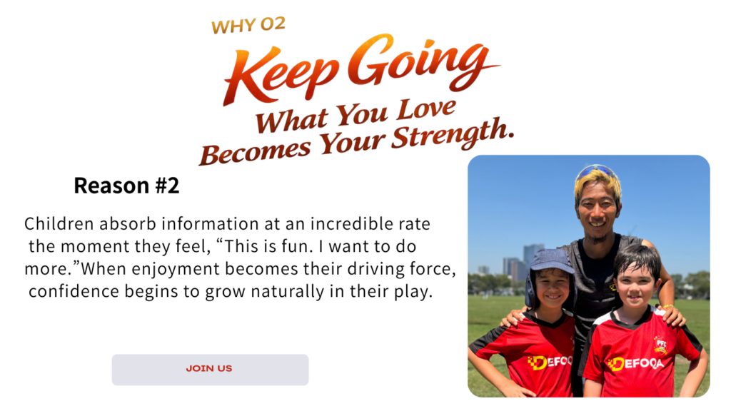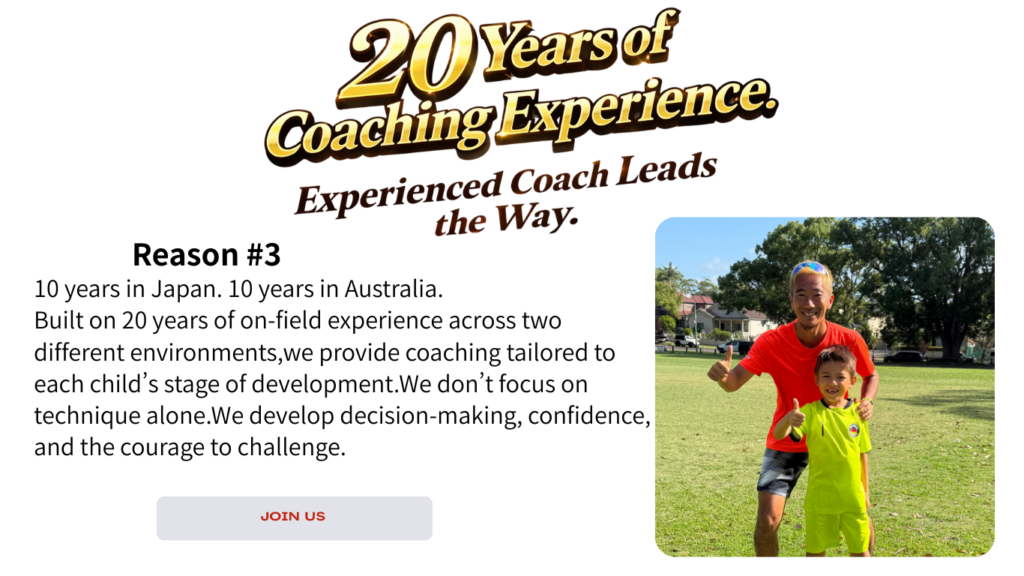 Thanks to Coach Takao’s motto of “Let’s enjoy soccer together!”, there are always smiles on our child’s face. Under the watchful and caring eye of his favorite coach, our son plays freely and with confidence — he’s more passionate about soccer than ever. The lessons are not just about improving skills. They also nurture kindness, a positive attitude, and teamwork with his peers. We recently had the chance to join an online lesson, and it was incredibly engaging — the kids stayed focused and fully involved until the very end. Coach Takao genuinely values each and every child. As a parent, I feel so grateful and reassured to have such a wonderful coach guiding our son. We truly appreciate everything, and look forward to what’s ahead.